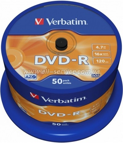Диск Verbatim DVD-R 4.7 GB/120 min 16x Cake Box 50шт (43548)