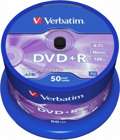Диск DVD+R Verbatim 4.7 GB/120 min 16x Silver 50 pcs Cake Box (43550)